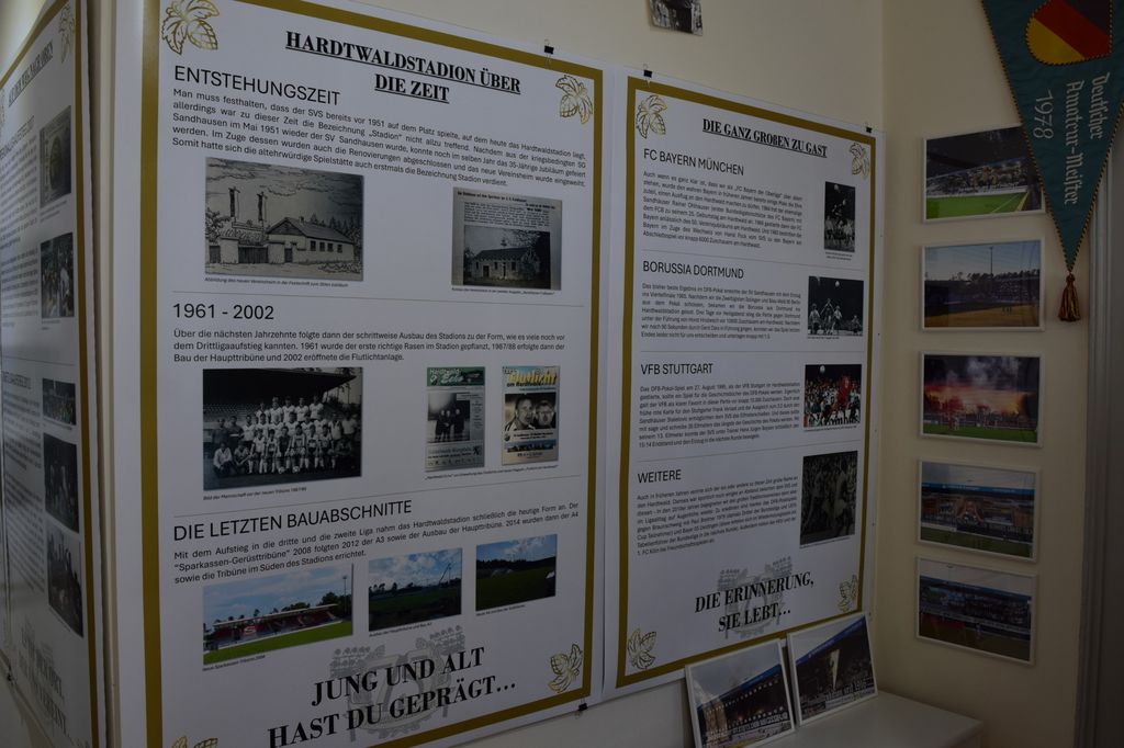 Gezeigt wurden zahlreiche besondere Erinnerungsstücke aus Stadion- und Vereinsgeschichte. Ein Großteil der Exponate stammte aus dem Archiv von Vorstandsmitglied Alfred Hack. Ferner erhielt das Organisationsteam Leihgaben von ehemaligen Spielern, Wegbegleitern und Fans. Ausgestellt wurden vor allem bedeutende Pokale, Trikots und historische Bilder, die die Entwicklung des SV Sandhausen und seines Stadions eindrucksvoll dokumentierten. Begleitet wurde das Jubiläum von einer eigens erarbeiteten Broschüre, in der die aktive Fanszene auf die Geschichte des Vereins zurückblickte. Sie spannte den Bogen von der Zeit lange vor dem Bau des Stadions über besondere Momente, Highlight-Spiele und Aufstiege bis in die Gegenwart.